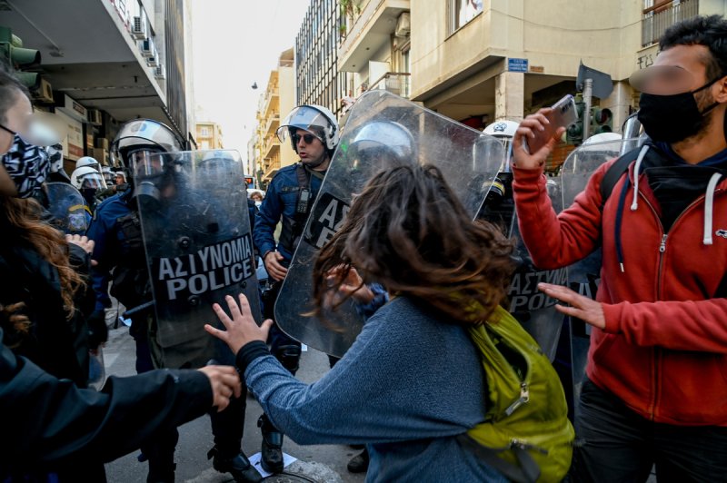 Οι πορευόμενοι αιφνιδιαστικά επιτέθηκαν με ρίψη πυροσβεστήρων, καρεκλών και άλλων αντικειμένων στις αστυνομικές δυνάμεις που ακολουθούσαν, οι οποίες άμεσα τους απώθησαν.