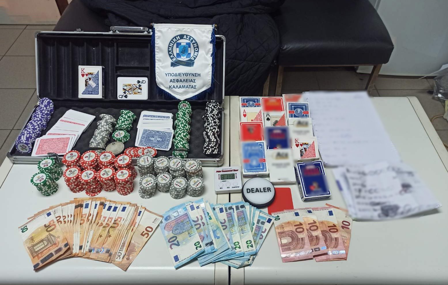 Κατά τον έλεγχο βρέθηκαν συνολικά και κατασχέθηκαν, -15- τράπουλες, -447- μάρκες πονταρίσματος, διαφόρων χρωμάτων, χρονόμετρο, κάρτες dealer , ιδιόχειρα σημειώματα και το χρηματικό ποσό των -1.995- ευρώ, ως προερχόμενο από τη διενέργεια παράνομου παιχνιδιού.